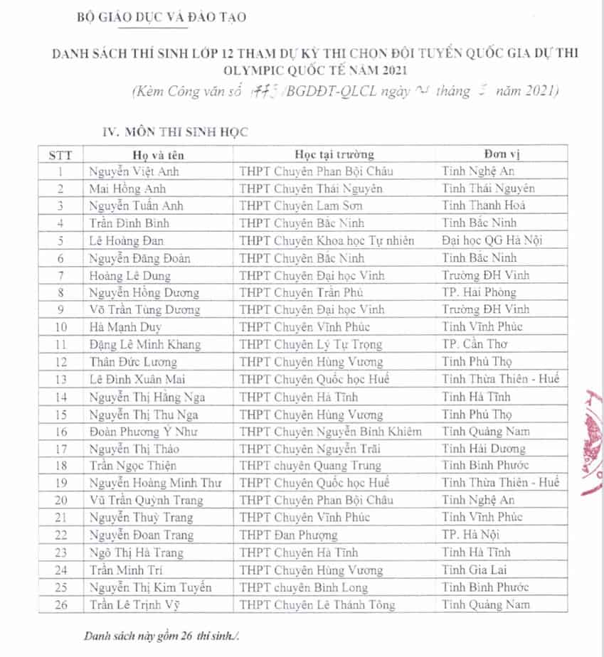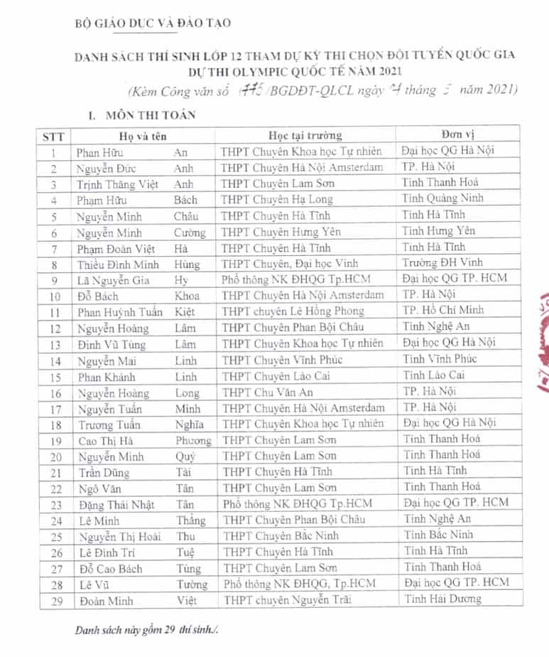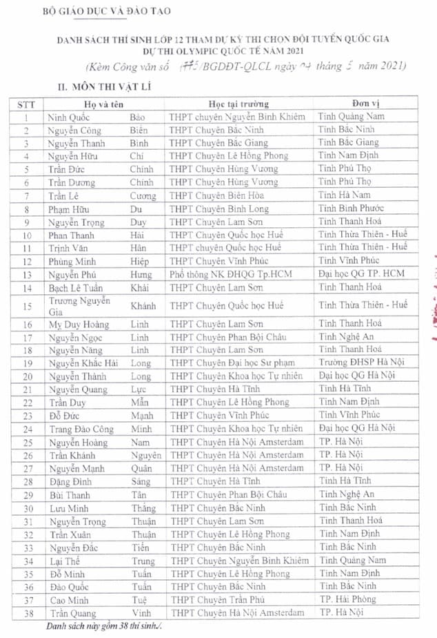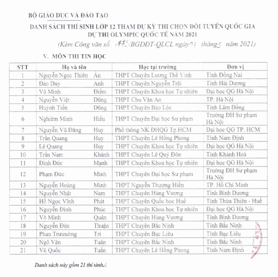 Theo Bộ GD&ĐT, đây là những học sinh lớp 12 đã tham dự kỳ thi chọn đội tuyển quốc gia các môn Toán, Lý, Hóa, Sinh học, Tin học dự thi Olympic quốc tế năm 2021.