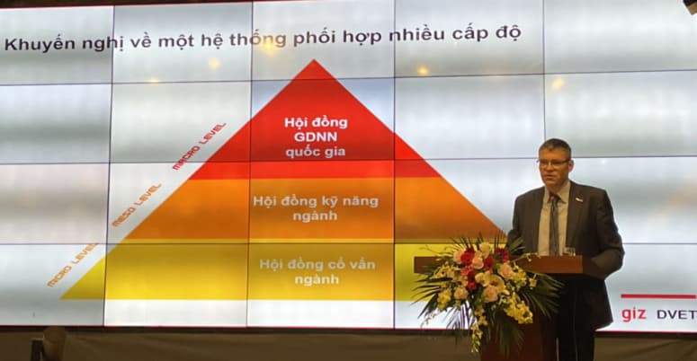 Trong đó, tham luận của TS. Jurgen Hartwig – Giám đốc Chương trình Đổi mới Đào tạo nghề Việt Nam về mô hình về giáo dục kép ở Đức và những khuyến nghị để nâng cao GDNN ở Việt Nam nhận được sự quan tâm đặc biệt của giới chuyên môn và những nhà làm chính sách. Theo TS. Jurgen Hartwig, phải phối hợp giữa các bên liên quan trong công tác quản lý GDNN ở Việt Nam. Cụ thể, cần có một hệ thống phối hợp nhiều cấp độ mà cao nhất là Hội đồng GDNN quốc gia, tiếp đến là Hội đồng kỹ năng ngành và cuối cùng là Hội đồng cố vấn ngành. Trong đó, Hội đồng GDNN quốc gia gồm dại diện của DVET, các bộ ngành, hiệp hội nghề nghiệp, phòng TM&CN, liên đoàn lao động, doanh nghiệp, Hội đồng kỹ năng ngành.