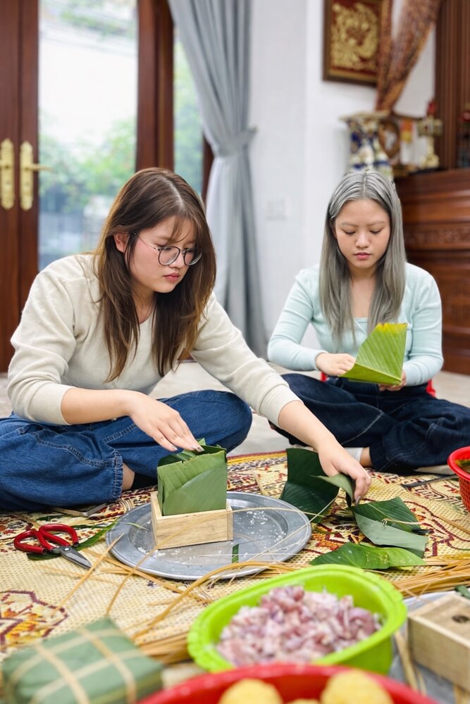 Người trẻ đam mê gói bánh chưng trong Tết Nguyên đán. Ảnh: Alex
