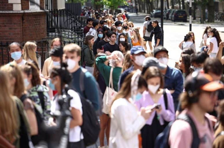 Xếp hàng bên ngoài một trung tâm tiêm chủng dành cho thanh niên và sinh viên ở London. Ảnh: Reuters