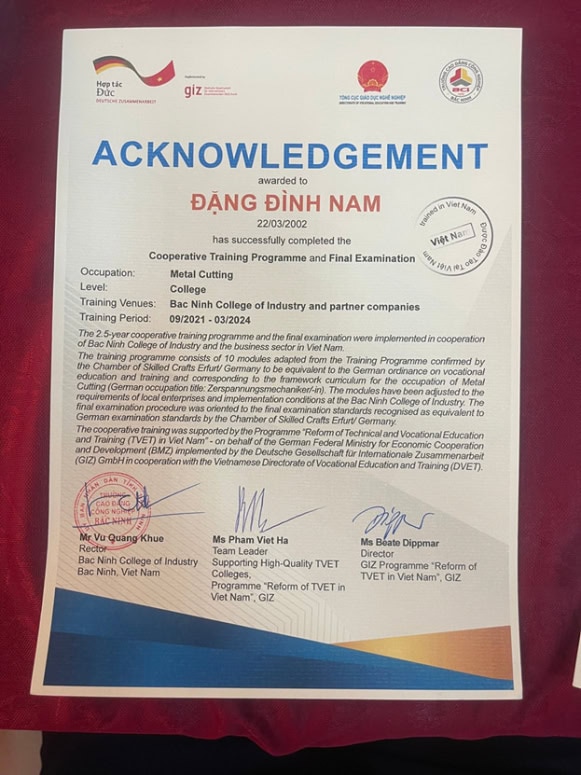 Sinh viên tốt nghiệp nghề CGKL và Điện tử Công nghiệp sẽ được công nhận và cấp chứng chỉ tương đương tiêu chuẩn thi tại Đức
