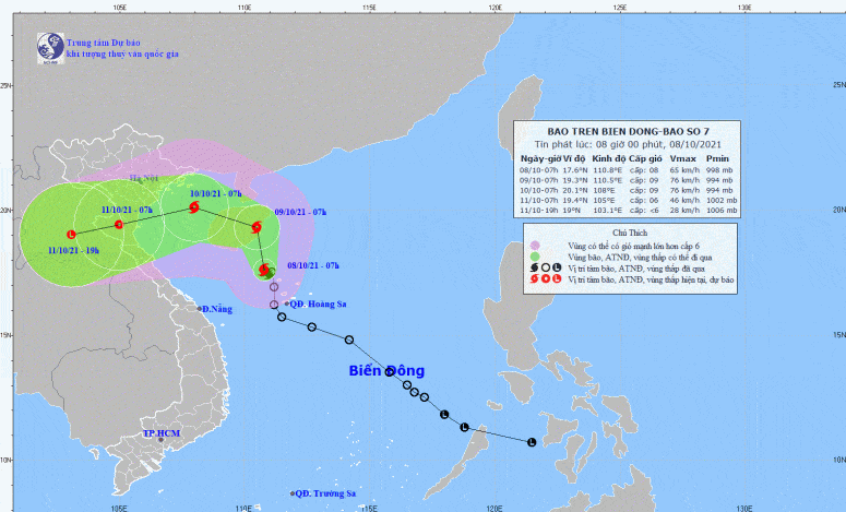 Hồi 7 giờ sáng nay, 8/10, vị trí tâm bão số 7 ở vào khoảng 17,6 độ Vĩ Bắc; 110,8 độ Kinh Đông, ngay trên vùng biển phía Tây Bắc quần đảo Hoàng Sa. Sức gió mạnh nhất vùng gần tâm bão mạnh cấp 8 (60-75km/giờ), giật cấp 10.