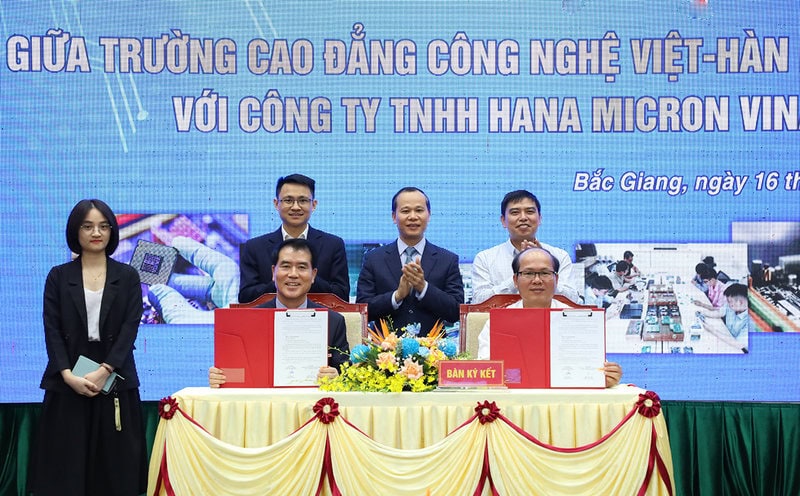Tại hội thảo đã diễn ra Lễ ký kết hợp tác giữa Công ty TNHH Hana Micron Vina với Trường Cao đẳng Công nghệ Việt – Hàn và Trường Cao đẳng Kỹ thuật công nghiệp Bắc Giang về đào tạo nhân lực bán dẫn phân khúc OSAT.