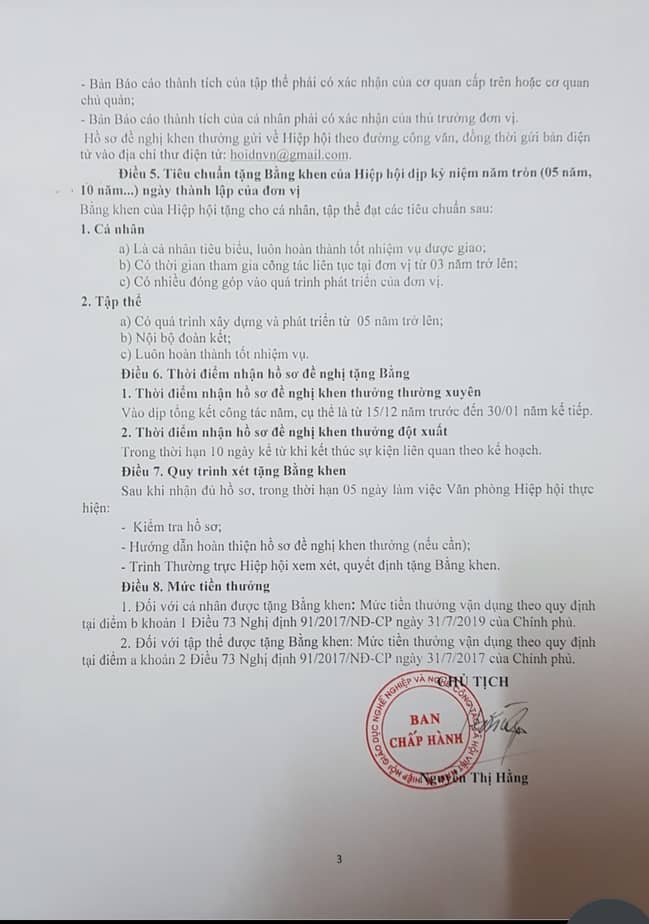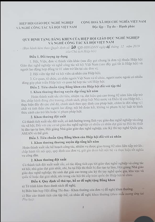 Chủ tịch Hiệp hội Giáo dục nghề nghiệp và nghề Công tác xã hội Việt Nam Nguyễn Thị Hằng vừa ký ban hành Quyết định số 20/QĐ-HHGDNN về quy định tặng Bằng khen của Hiệp hội.