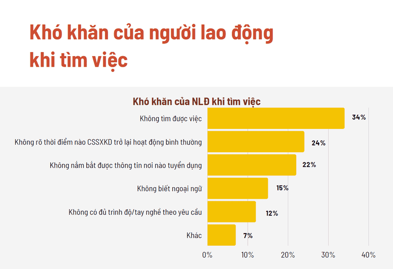 Trước kết quả trên, có 32,4% người lao động tham gia khảo sát cho rằng nguyên nhân họ bị mất việc là do cơ sở sản xuất, kinh doanh đóng cửa, phá sản hoặc tạm ngừng kinh doanh. Trong khi có 27,1% đưa ra nguyên nhân do cơ sở sản xuất, kinh doanh phải sa thải lao động để cắt giảm chi phí do không có đơn hàng.