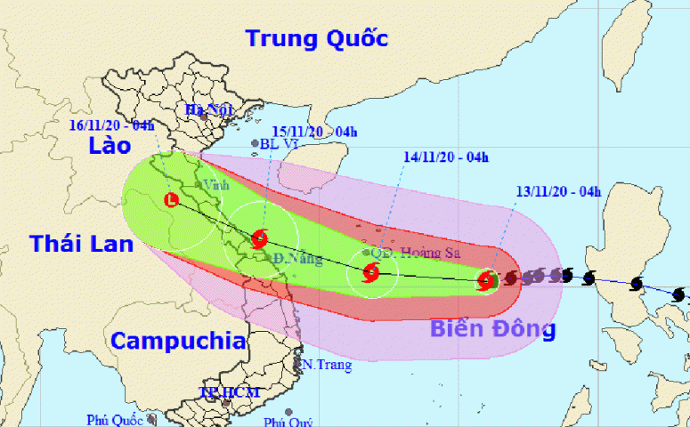 Bão tiếp tục di chuyển theo hướng Tây, mỗi giờ đi được 15-20km. Đến 4 giờ ngày 14-11, tâm bão ở khoảng 15,5 độ Vĩ Bắc; 111,9 độ Kinh Đông, trên vùng biển phía Nam của quần đảo Hoàng Sa. Sức gió mạnh nhất vùng gần tâm bão mạnh cấp 12 (115-135km/giờ), giật cấp 15.