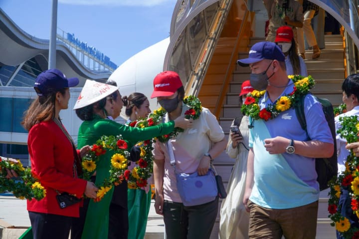 Những hành khách trên chuyến bay đầu tiên trở lại Nha Trang của Vietjet từ thủ đô Seoul được chào đón nồng nhiệt