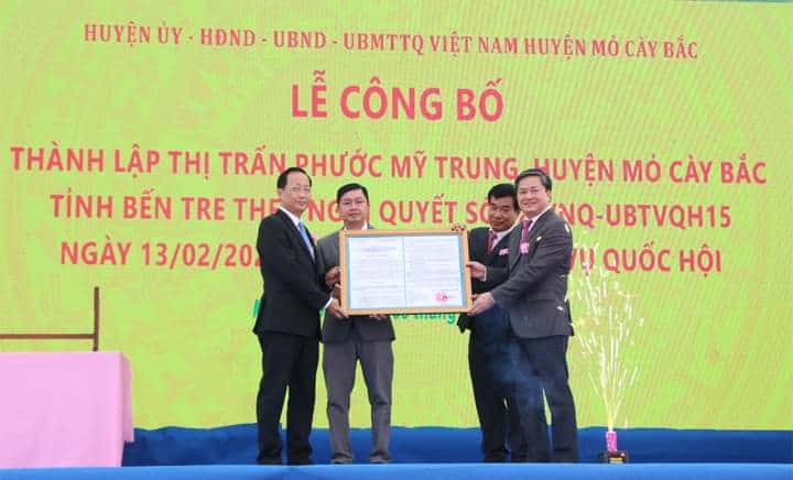 Ngày 6/4/2023, Huyện ủy, HĐND, UBND, Ủy ban MTTQ Việt Nam huyện Mỏ Cày Bắc tổ chức lễ công bố thành lập thị trấn Phước Mỹ Trung thuộc huyện Mỏ Cày Bắc theo Nghị quyết số 724/NQ-UBTVQH15 (ngày 13-2-2023) do Chủ tịch Quốc hội Vương Đình Huệ đã ký ban hành.