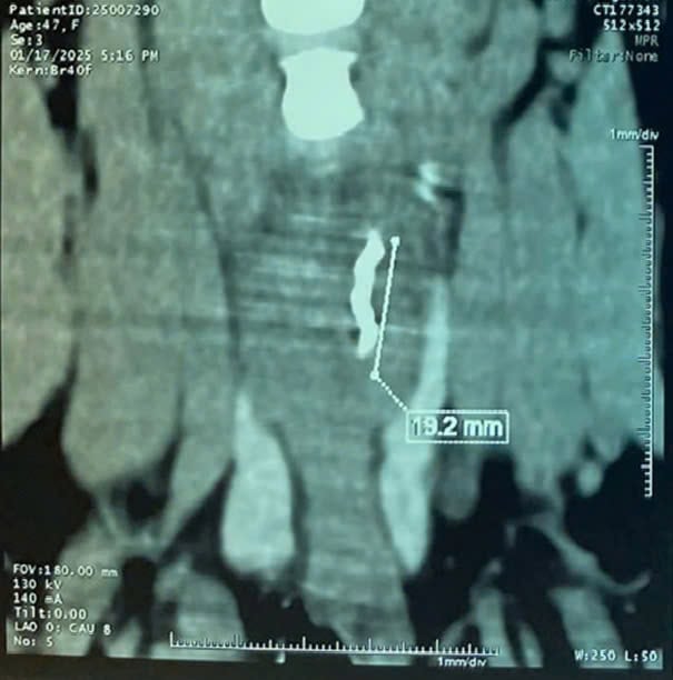 Cùng thời điểm, một nữ bệnh nhân khác 47 tuổi ở Bình Phước cũng nhập viện sau khi nuốt đau, đã đến thăm khám và uống thuốc ở một bệnh viện tư nhưng không hiệu quả. Người này cho biết, 10 ngày trước, sau khi ăn cơm với cá kho thì nuốt bị đau. Cho rằng mình hóc xương cá nên bệnh nhân đã đến khám tại một bệnh viện tư, được nội soi nhưng không thấy dị vật. Bác sĩ tại đây đã cho thuốc uống, nhưng đến nay bệnh không thuyên giảm, cơn đau tăng dần.