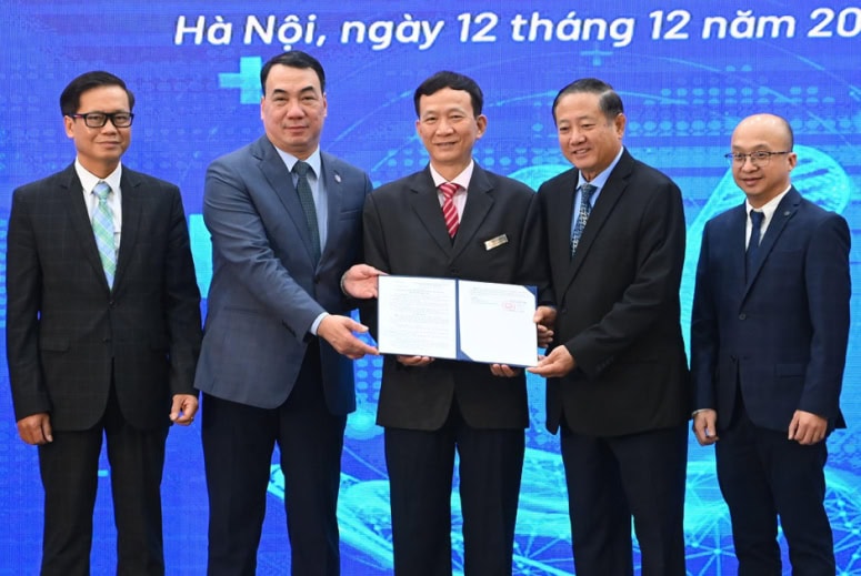 TS Nguyễn Ngô Quang, Cục trưởng Cục Khoa học công nghệ và Đào tạo, Bộ Y tế (thứ hai từ trái qua) trao “Quyết định phê duyệt triển khai thử nghiệm lâm sàng VISTA-1” cho đại diện Hệ thống Bệnh viện Đa khoa Tâm Anh. Ảnh: BVĐK Tâm Anh.