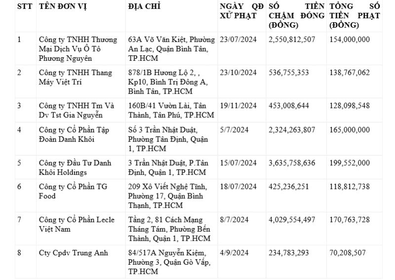 Cơ quan Bảo hiểm xã hội TP.HCM vừa công bố danh sách đơn vị bị xử phạt vi phạm hành chính về đóng BHXH, BHYT (số liệu tính đến ngày 14/4/2025).