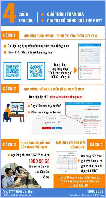 Cách thứ nhất: tra cứu qua ứng dụng “VssID – BHXH số” của BHXH Việt Nam. Để tra cứu thời hạn sử dụng thẻ, quá trình tham gia, thụ hưởng BHYT tại ứng dụng này, người tham gia chỉ cần cài đặt ứng dụng VssID trên nền tảng điện thoại thông minh và thực hiện đăng ký tài khoản để sử dụng ứng dụng.