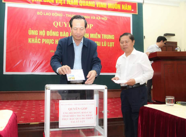 Ngày 19/10/2020, Bộ LĐ-TB&XH đã tổ chức Lễ quyên góp ủng hộ đồng bào các tỉnh miền Trung khắc phục hậu quả do thiên tai lũ lụt. Ngay tại buổi lễ, Bộ LĐ-TB&XH đã quyên góp được 350 triệu đồng. Số tiền này sẽ được Bộ kịp thời chuyển đến đồng bào miền Trung trong thời gian sớm nhất.