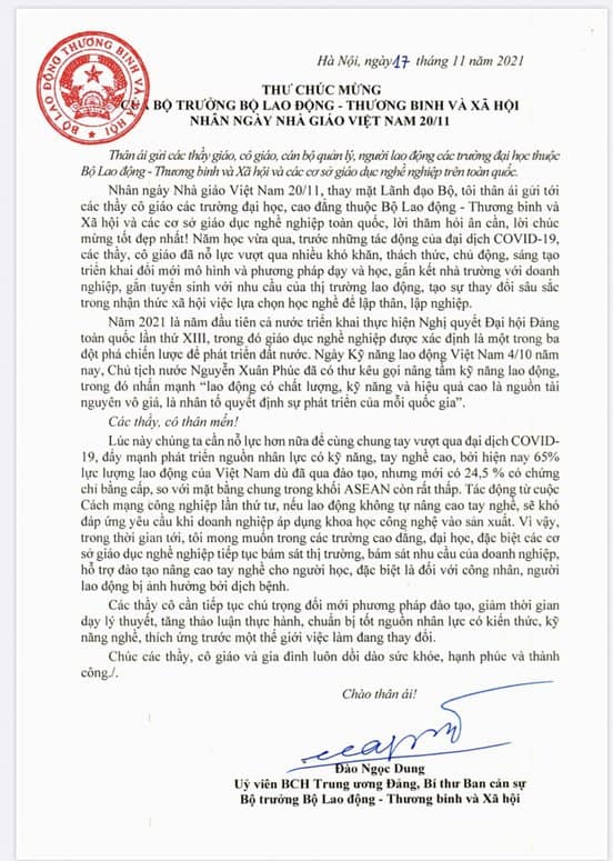 Nhân dịp ngày Nhà giáo Việt Nam 20/11, ngày 17/11 thay mặt Ban cán sự Đảng và Lãnh đạo Bộ LĐ-TBXH, Bộ trưởng Đào Ngọc Dung gửi tới các thầy cô giáo, cán bộ, công chức, viên chức các trường đại học thuộc Bộ LĐ-TB&XH và các cơ sở giáo dục nghề nghiệp trên toàn quốc lời thăm hỏi ân cần và lời chúc mừng tốt đẹp nhất!