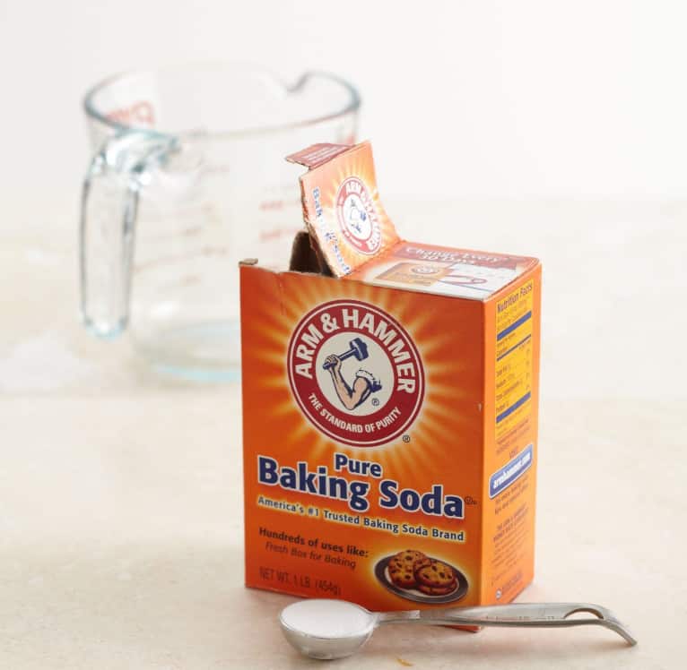 - Trộn baking soda và nước theo tỉ lệ 1:1, khuấy đều cho đến khi có được một hỗn hợp sánh, mịn.