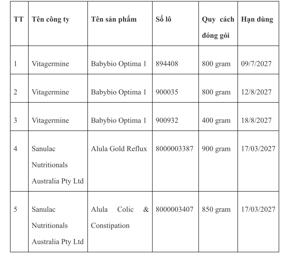 Trên cơ sở cảnh báo quốc tế và qua công tác hậu kiểm việc đăng ký bản công bố, tự công bố, sản xuất và kinh doanh thực phẩm, Cục An toàn thực phẩm phát hiện sản phẩm thực phẩm công thức Babybio Optima 1 do Công ty Vitagermine sản xuất đang được quảng cáo, kinh doanh trên Lazada và Shopee; Sản phẩm thực phẩm công thức Alula Gold Reflux do Công ty Sanulac Nutritionals Australia Pty Ltd sản xuất đang được quảng cáo, kinh doanh trên Ausmart.