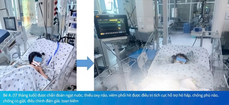 Khi nhập viện, bé thở mệt, co giật, SpO₂ chỉ còn 95%, phổi tổn thương cả hai bên, não phù nhẹ hai bán cầu. Các bác sĩ lập tức đặt nội khí quản, dùng thuốc chống phù não, kháng sinh, chống co giật và điều chỉnh điện giải, toan kiềm. Sau hơn một tuần hồi sức tích cực, bé cai được máy thở, tỉnh táo, tiếp xúc tốt, và được chuyển sang Khoa Hô hấp để tiếp tục điều trị.