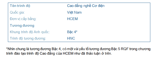 Trường đạt tiêu chuẩn OFSED Kiểm định chất lượng giáo dục hàng đầu của Hội đồng Anh năm 2018. Tháng 3 năm 2022, được Hội đồng Anh Việt Nam công nhận đối sánh trình độ cao đẳng nghề Cơ điện tương đương Bậc 4-5 khung Trình độ Quốc gia Anh quốc (RQF) và Bậc 5 khung Trình độ châu Âu (EQF).