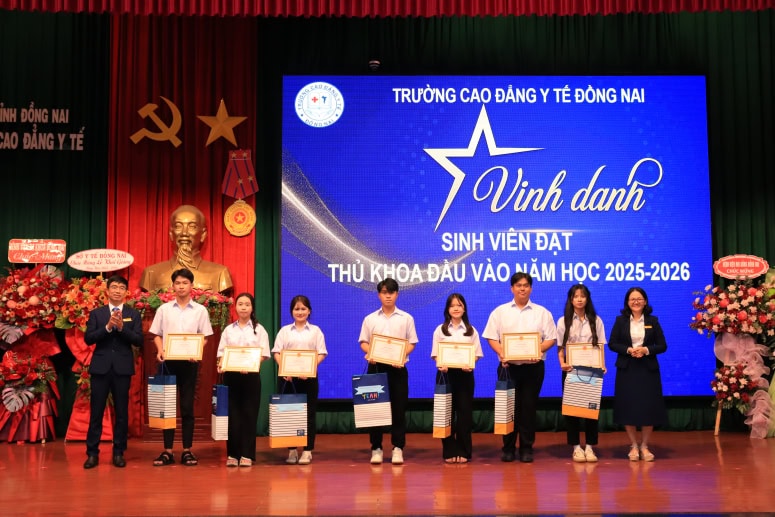 Trường Cao đẳng Y tế Đồng Nai trao bằng khen và quà cho 7 tân sinh viên là thủ khoa của 7 ngành.