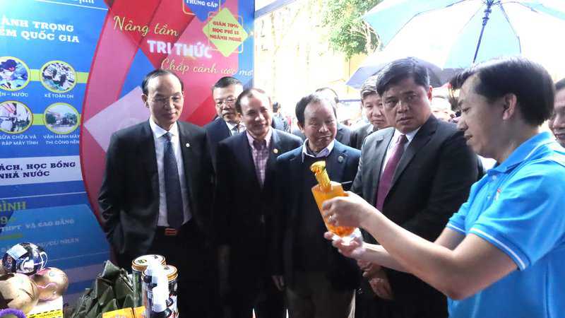 Thứ trưởng Trần Thanh Nam tham quan gian hàng của Trường CĐ Cơ điện – Xây dựng và Nông lâm Trung Bộ