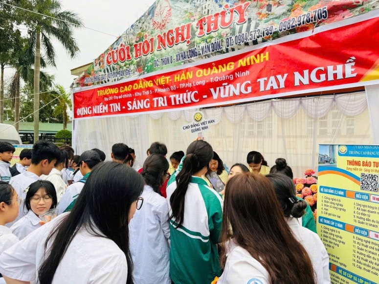 Tại các điểm trường THPT Quảng Hà (huyện Hải Hà), trường THPT Hải Đảo (huyện Vân Đồn), gian hàng tư vấn tuyển sinh, định hướng nghề nghề nghiệp của trường CĐ Việt – Hàn Quảng Ninh được hàng nghìn học sinh quan tâm, tìm hiểu, không chỉ giúp các em học sinh cuối cấp THPT mà còn giúp các em học sinh cấp THCS sớm định hướng chọn trường, chọn nghề phù hợp.