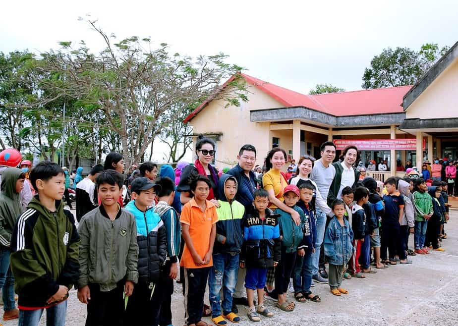 Hoa hậu Doanh nhân Mai Thanh cùng các em học sinh nghèo xã Đăk Ha. Ảnh: Nguyễn Thanh Tú
