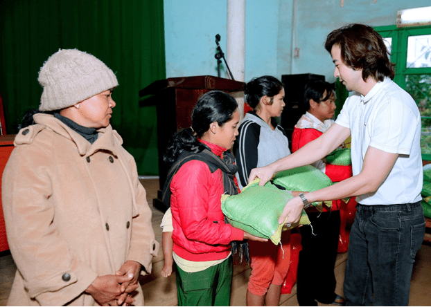 Diễn viên Đoàn Minh Tài và Hoa hậu Doanh nhân Mai Thanh trao gạo và nhu yếu phẩm cho bà con nghèo. Ảnh: Nguyễn Thanh Tú
