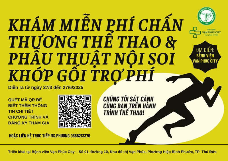 Thông tin chi tiết về chương trình “Khám miễn phí chấn thương thể thao và phẫu thuật nội soi khớp gối có hỗ trợ chi phí” do Bệnh viện Vạn Phúc City phối hợp với Hội Y học thể thao TP. Hồ Chí Minh tổ chức: