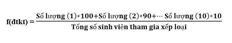 Hàm f(đtkt) trả về giá trị từ điểm thi kết thúc MĐ/MH. Điểm thi kết thúc MĐ/MH được tính theo thang điểm 10 và được quy đổi về thang điểm 100 (của một lớp học). Xác định giá trị cho hàm f(đtkt) như sau: