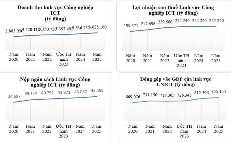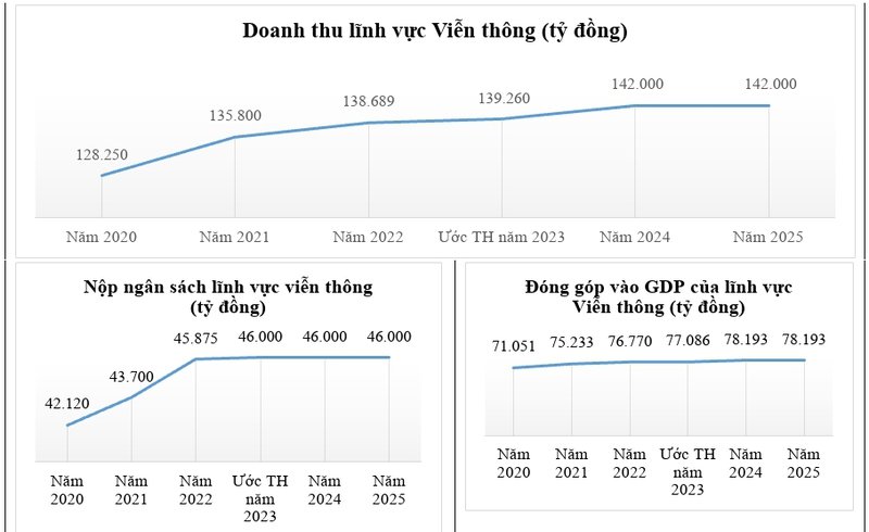 Năm 2023, doanh thu toàn ngành ước đạt 3.744.214 tỷ đồng, tăng 1,49% so với năm 2022; Nộp ngân sách nhà nước ước đạt 99.323 tỷ đồng, tăng 1,31% so với năm 2022; Đóng góp vào GDP của ngành TT&TT ước đạt 887.398 tỷ đồng, tăng 1,34% so với năm 2022; Tổng số lao động toàn Ngành năm 2023 ước khoảng 1.767.766 lao động, tăng 2,72% so với năm 2022.