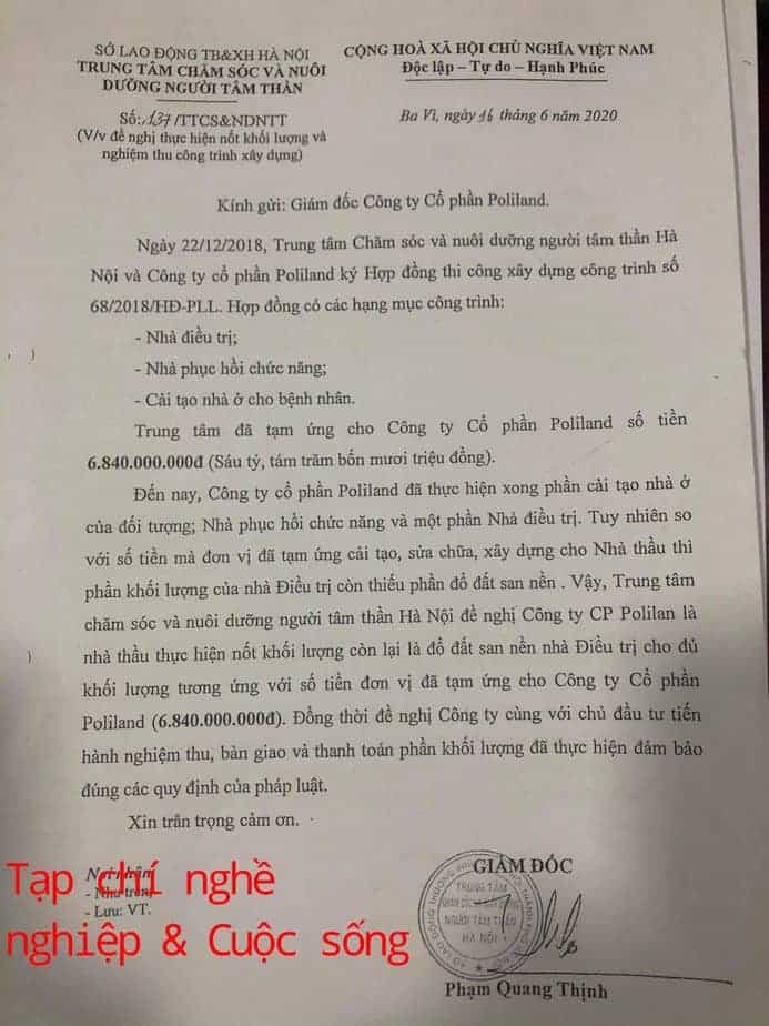 Công văn số 137/TTCS&NDNTT của Trung tâm Chăm sóc sức khỏe và nuôi dưỡng người tâm thần Hà Nội gửi Công ty Cổ phần Poliland thể hiện rõ thông tin hợp đồng được ký kết giữa hai bên và số tiền mà trung tâm đã tạm ứng