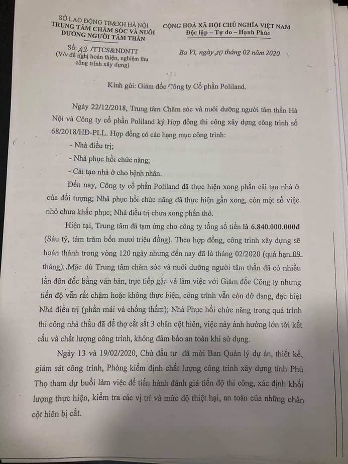 Vậy, Trung tâm Chăm sóc và Nuôi dưỡng người tâm thần Hà Nội đề nghị Công ty Cổ phần Poliland thực hiện nốt khối lượng còn lại là đổ đất san nền nhà điều trị… Đồng thời đề nghị công ty cùng với chủ đầu tư tiến hành nghiệm thu, bàn giao và thanh toán phần khối lượng đã thực hiện đảm bảo đúng các quy định của pháp luật”.