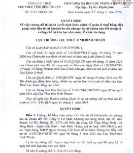 Cục Thuế tỉnh Bình Thuận yêu cầu Công ty Cổ phần Khoáng sản Sông Bình phải nghiêm chỉnh thực hiện Quyết định. Quyết định có hiệu lực từ ngày 16/8/2024 đến ngày 16/9/2024.