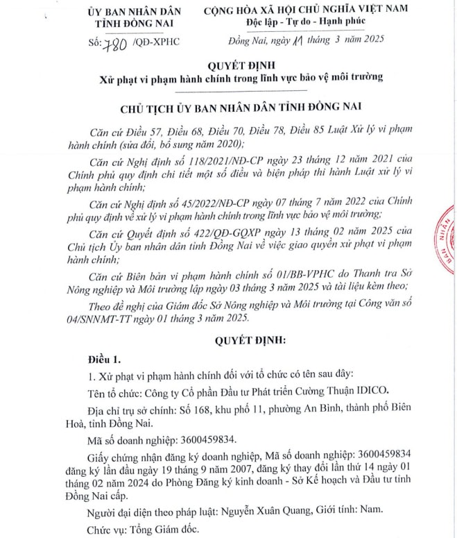 Ngày 11/3, UBND tỉnh Đồng Nai đã ban hành quyết định xử phạt vi phạm hành chính trong lĩnh vực bảo vệ môi trường đối với Công ty Cổ phần Đầu tư Phát triển Cường Thuận IDICO (sau đây gọi tắt là Cường Thuận IDICO), có trụ sở tại số 168, KP 11, phường An Bình, TP. Biên Hòa, tỉnh Đồng Nai. Người đại diện pháp luật của công ty là ông Nguyễn Xuân Quang, Tổng Giám đốc.