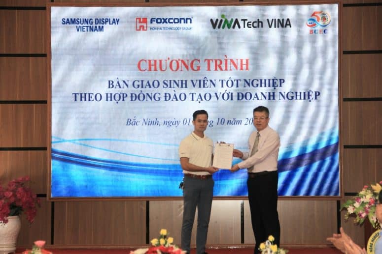 Cũng trong khuôn khổ của Hội thảo này, Nhà trường đã vinh dự và tự hào được bàn giao 99 sinh viên cho các Doanh nghiệp lớn bao gồm: Tập đoàn KHKT Hồng Hải FOXCONN, Công ty TNHH Samsung Display Việt Nam(SDV), Công ty TNHH Vinatech, Công ty TNHH một thành viên công nghệ Phúc Sơn…  Để có nguồn nhân lực giỏi như vậy, các doanh nghiệp đã có cơ chế chính sách “học bổng”, khuyến khích tuyệt vời cho các em sinh viên năm thứ hai, thứ ba của Nhà trường vừa học vừa làm, vừa có lương; giá trị đó mang lại lợi ích cho cả 3 bên: Nhà trường- Sinh viên- Doanh nghiệp.