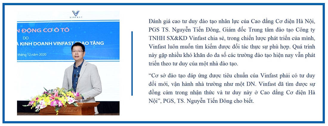 Như một lời khẳng định quan điểm này của Hiệu trưởng Ngọc, khi đánh giá về tư duy đào tạo nhân lực của HCEM, PGS.TS Nguyễn Tiến Đông – Giám đốc Trung tâm Đào tạo Công ty TNHH SX&KD VinFast – đối tác hợp tác đào tạo song hành của HCEM đã từng nhận xét: “Trong chiến lược phát triển của mình, VinFast luôn tìm kiếm đối tác thực sự phù hợp. Quá trình này thực sự khó khăn do đa số các trường đào tạo hiện nay vẫn phát triển theo tư duy của một nhà đào tạo. Cơ sở đào tạo đáp ứng được tiêu chuẩn của VinFast phải có tư duy đổi mới, vận hành nhà trường như một doanh nghiệp. VinFast đã tìm được sự đồng cảm trong nhận thức và tư duy này ở HCEM”.