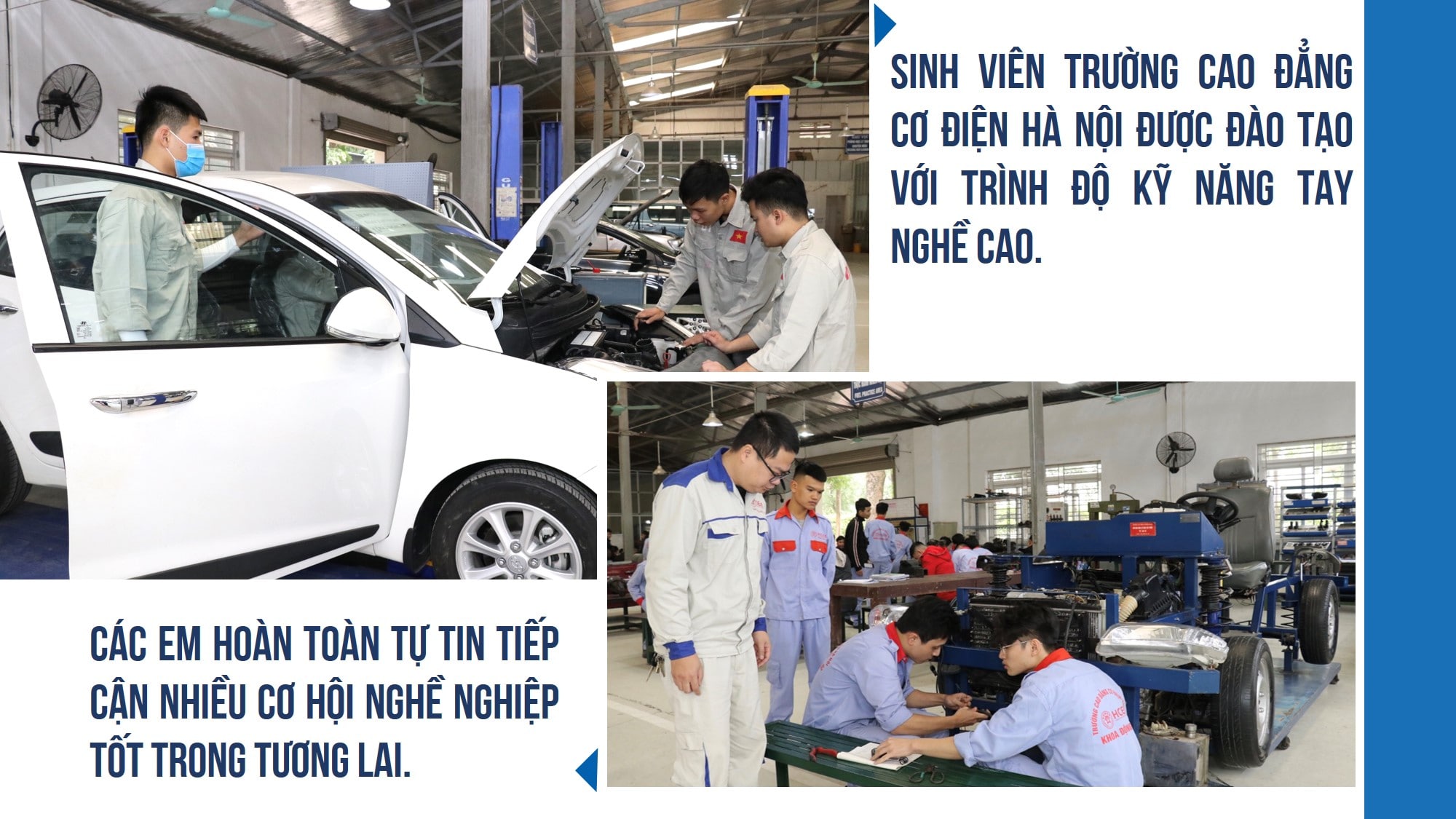 “Ngoài những yếu tố về đảm bảo giãn cách xã hội, tránh lây lan dịch bệnh khi ấy, chuyển đổi số chính là một là xu hướng học tập mở, linh hoạt, đáp ứng được nhu cầu và cách thức tiếp cận mới của sinh viên. Chúng tôi đã quản lý và vận hành cơ sở GDNN trên nền tảng số, kết hợp giữa nhà trường và doanh nghiệp cũng trên nền tảng số. Nhà trường thường xuyên tổ chức các buổi tập huấn kỹ năng cho cả giáo viên, HSSV về các kỹ năng để tiếp cận với công nghệ số… Đây thực sự là một cuộc cách mạng công nghệ với tốc độ dồn dập ở Cao đẳng  Cơ điện Hà Nội”, Hiệu trưởng Ngọc nói.