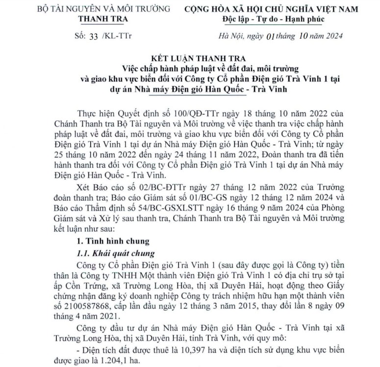 Thanh tra Bộ Tài nguyên và Môi trường cũng đề nghị Công ty Cổ phần Điện gió Trà Vinh 1 thực hiện nghiêm túc kết luận thanh tra và báo cáo kết quả thực hiện về Thanh tra Bộ và Sở Tài nguyên và Môi trường tỉnh Trà Vinh trước ngày 31/12/2024./.