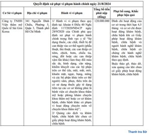 Cũng trong đợt này, Công ty TNHH Viện thẩm mỹ Quốc tế Sài Gòn Korea có địa chỉ tại số 341 Nguyễn Đình Chiểu, phường 5, quận 3, TP.HCM bị Thanh tra Sở Y tế xử phạt với số tiền 120 triệu đồng, đình chỉ hoạt động trong thời hạn 4,5 tháng và buộc phải tháo gỡ, tháo dỡ, xóa quảng cáo khi chưa có giấy phép hoạt động khám bệnh, chữa bệnh và chỉ được hoạt động trở lại khi có giấy phép hoạt động khám bệnh, chữa bệnh và người hành nghề khám bệnh, chữa bệnh có chứng chỉ hành nghề theo quy định.