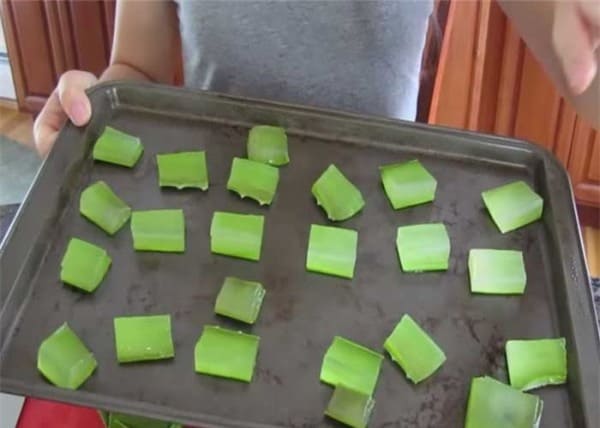 Bước 3: Đông lạnh nha đam trong 5 – 6 tiếng. Sau khi nha đam đông cứng, bạn tách ra và cho vào túi zip, tiếp tục bảo quản trên ngăn đá rồi dùng dần.