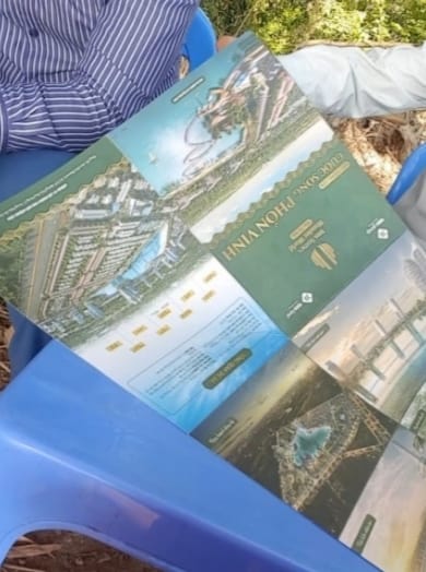 Ngay tại khu vực một quán nước lụp xụp với vài ba cái bàn trước cổng dự án TMS Đầm Cói, hàng chục nhân viên của sàn bất động sản Hải Phát – Hải Phát Land với sơ mi trắng, trên tay là những hình ảnh quảng cáo bắt mắt về dự án TMS Đầm Cói – TMS Homes Wonder World.