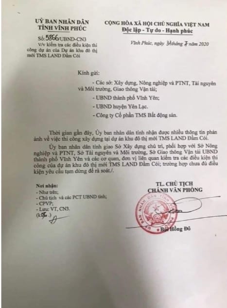 Liên quan đến dự án trên, ngày 31/7/2020 UBND tỉnh Vĩnh Phúc đã có Văn bản số 5866/UBND-CN3 về việc kiểm tra các điều kiện thi công dự án của Dự án khu đô thị mới TMS Land Đầm Cói; Trường hợp chưa đủ điều kiện yêu cầu tạm dừng để rà soát.