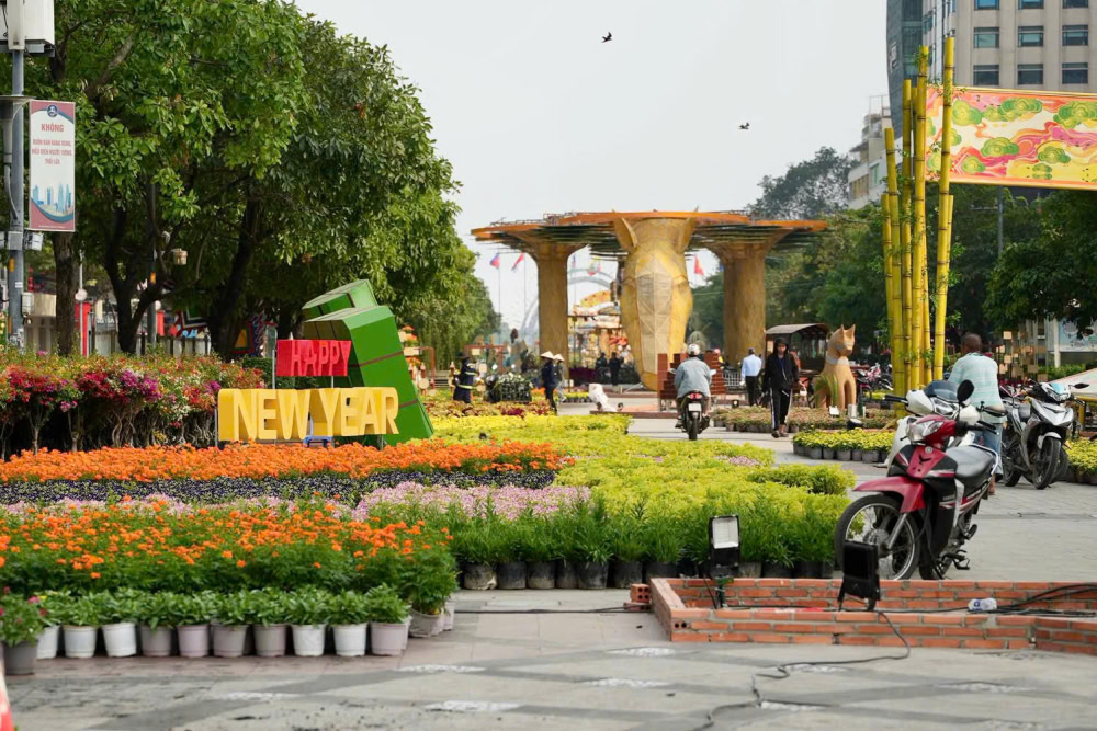 Chiều 10/2, tại khu vực phố đi bộ Nguyễn Huệ, TP.HCM, hàng chục công nhân đang khẩn trương thi công để kịp hoàn thiện Đường hoa Tết trước thời điểm mở cửa phục vụ người dân và du khách.