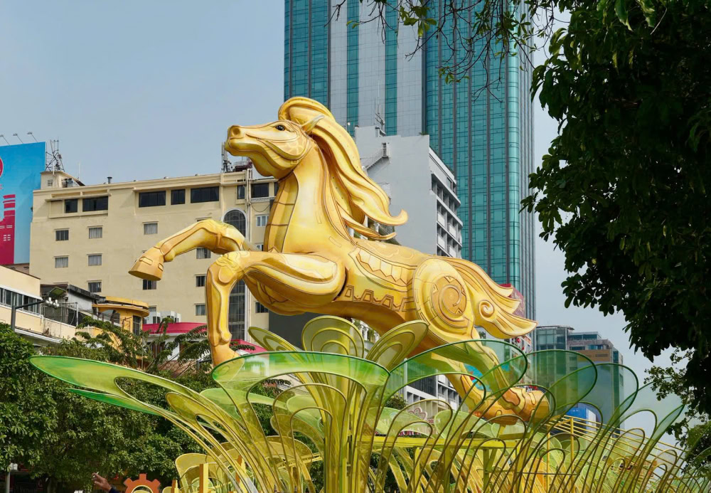 Điểm nhấn nổi bật năm nay là linh vật ngựa cao gần 7m, dài 9m, màu vàng chủ đạo, được lấy cảm hứng từ hình tượng ngựa của Thánh Gióng, tượng trưng cho sức mạnh và khát vọng vươn lên.