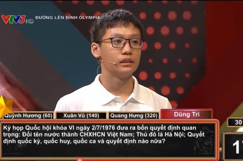 Cụ thể, tại cuộc thi tháng 1 quý 4 Đường lên đỉnh Olympia phát sóng chiều 12/7, câu hỏi 30 điểm ở phần thi Về đích của thí sinh Lưu Đào Dũng Trí (THPT Chuyên ĐH Sư phạm Hà Nội) như sau: “Kỳ họp Quốc hội Khóa VI ngày 2/7/1976 đưa ra 4 quyết định quan trọng: Đổi tên nước thành CHXHCN Việt Nam; Thủ đô là Hà Nội; Quyết định quốc huy, quốc kỳ, quốc ca và quyết định nào nữa?”.
