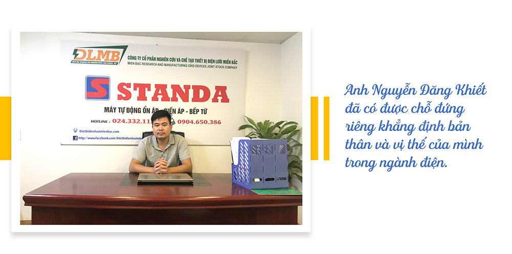 Để có được thành công như ngày hôm nay, Khiết đã trải qua 12 năm lăn lộn làm thuê cho rất nhiều công ty sản xuất thiết bị điện, kinh qua rất nhiều vị trí từ nhân viên kỹ thuật, nhân viên kinh doanh, đến thủ kho, thậm chí là kế toán để học tập kinh nghiệm. Không chỉ có vậy, trước khi tập hợp bốn người bạn khác cùng nhau góp vốn thành lập Công ty CP Nghiên cứu và Chế tạo Điện lưới Miền Bắc vào năm 2015, anh đã dành hơn một năm chỉ để đi khắp các ngõ ngách của Hà Nội, vào từng nhà dân, sửa từng chiếc tivi, tủ lạnh, máy giặt, bóng đèn… “Việc đó giúp tôi tìm hiểu thị hiếu người tiêu dùng, sản xuất ra được những sản phẩm đáp ứng tốt nhất nhu cầu của khách hàng” – anh Khiết chia sẻ.