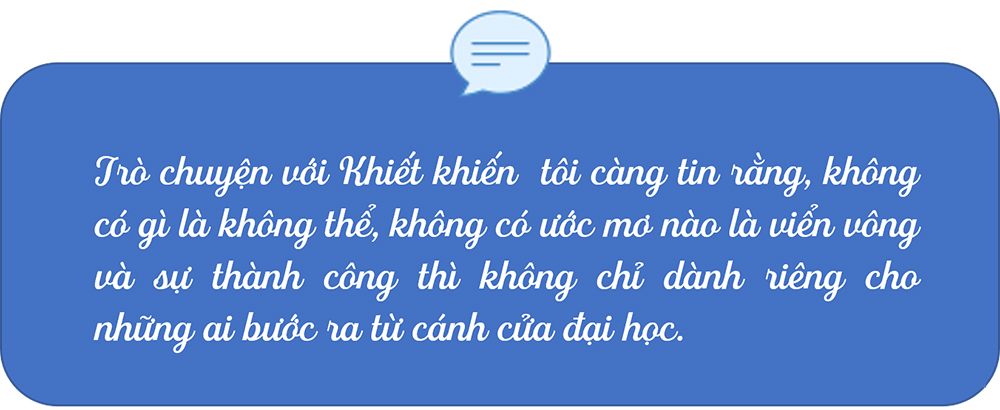 Với Khiết, lựa chọn học nghề là một quyết định đúng đắn, là bước ngoặt thay đổi cuộc sống và tương lai của chàng trai nghèo năm ấy. Nhớ lại những ngày còn học tại Trường Cao đẳng Cơ điện Hà Nội chính là nhớ lại quãng đời tuổi trẻ tràn đầy năng lượng, dám nghĩ dám làm, phấn đấu hết mình cho ước mơ phía trước.