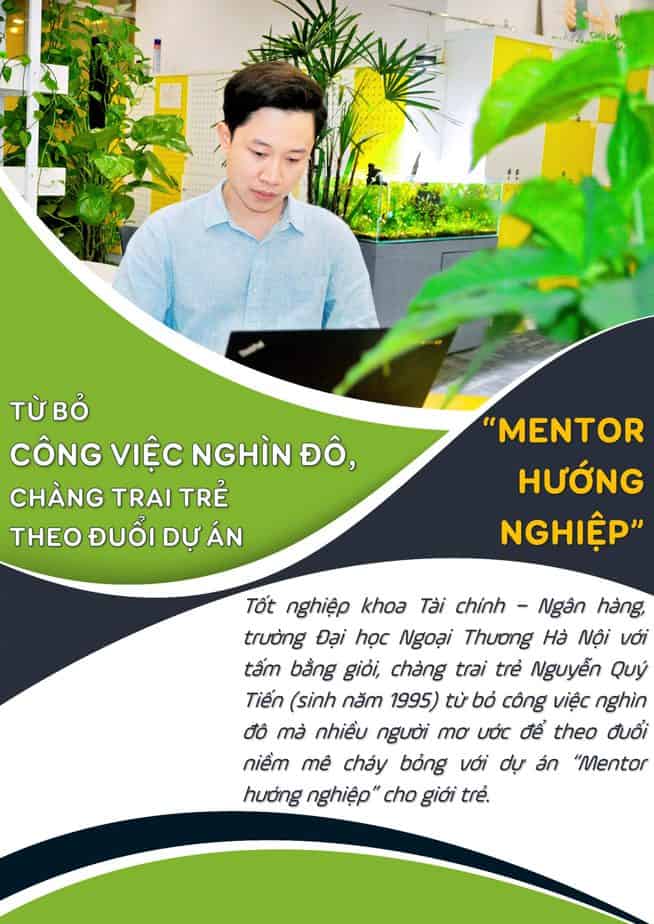 Gặp Tiến tại văn phòng làm việc đặt tại tòa nhà Keangnam, chúng tôi nhanh chóng bị thu hút ngay bởi tác giả của dự án “Mentor hướng nghiệp” là một chàng trai còn quá trẻ, giàu năng lượng với nụ cười tươi tắn cùng phong cách giản dị, dễ gần. Vừa trải qua cuộc họp “căng não” với các thành viên trong công ty, Tiến chọn cho mình 1 góc ngồi, nơi có nhiều cây xanh và sắc màu tươi sáng để bắt đầu câu chuyện.