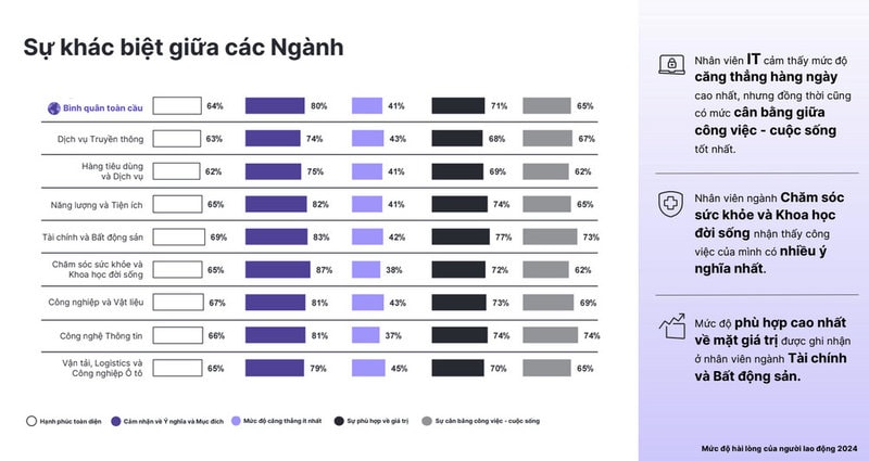 Xét theo ngành, nhân viên IT cảm thấy mức độ căng thẳng hàng ngày cao nhất, nhưng đồng thời cũng có mức cân bằng giữa công việc – cuộc sống tốt nhất. Nhân viên ngành chăm sóc sức khỏe và khoa học đời sống nhận thấy công việc của mình có nhiều ý nghĩa nhất. Song mức độ phù hợp cao nhất về mặt giá trị lại được ghi nhận ở nhân viên ngành tài chính và bất động sản…