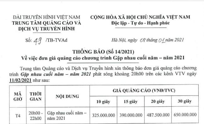 Trước đó, bảng báo giá quảng cáo do TVAd mời chào trong chương trình Gặp nhau cuối năm 2020 theo thông báo số 03/2020 thì giá quảng cáo trong 10 giây là 200 triệu đồng; 15 giây là 240 triệu đồng; 300 triệu đồng cho 20 giây quảng cáo và 400 triệu đồng cho 30 giây.